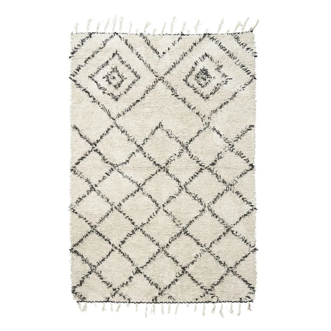 La alfombra Kuba de la marca danesa House Doctor tiene un pelo un poco más largo que las clásicas alfombras de nudos. Es increíblemente suave para caminar sobre ella y crea una sensación cálida y acogedora en el hogar. La alfombra tiene un patrón de tendencia con rombos en color negro y encaja fácilmente con otros textiles y decoración. ¡Perfecta para colocar delante del sofá en el salón!